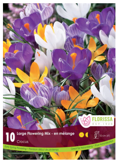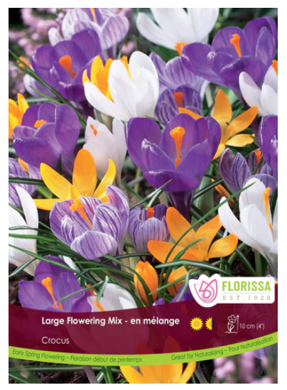 Crocus Large Flowering Mix is a cheerful blend of top performing cultivars in a range of colours and patterns. They are sure to brighten your early spring garden and lift your spirits as they herald the arrival of the new gardening season. Plant them in borders or naturalize them in your lawn.