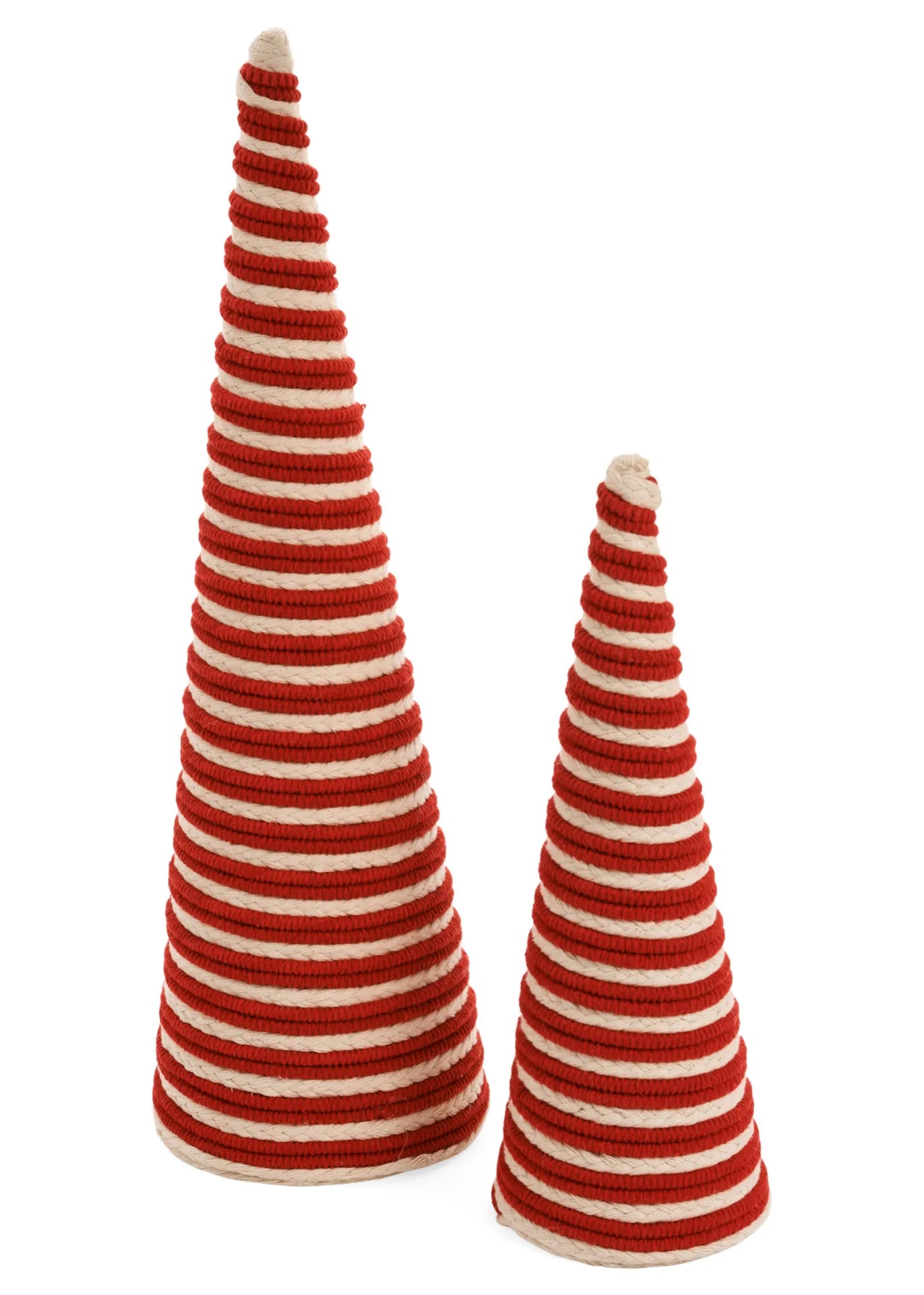 Bring some cheerful colour and whimsy to your holiday table with this whimsical duo of cone-shaped trees. Standing in three graduated sizes, the red and white striped conifers are the perfect pop of pattern whether nestled into a centerpiece or shining as a solo accent on a console table or shelf. Traditional yet playful, these festive firs are a fun focal point without fuss. Whether you favour the rustic or the refined, their combination of colours and sizes lend visual interest to any celebration spread. At just a glance, they'll lift everyone's spirits long before the first gift is opened.