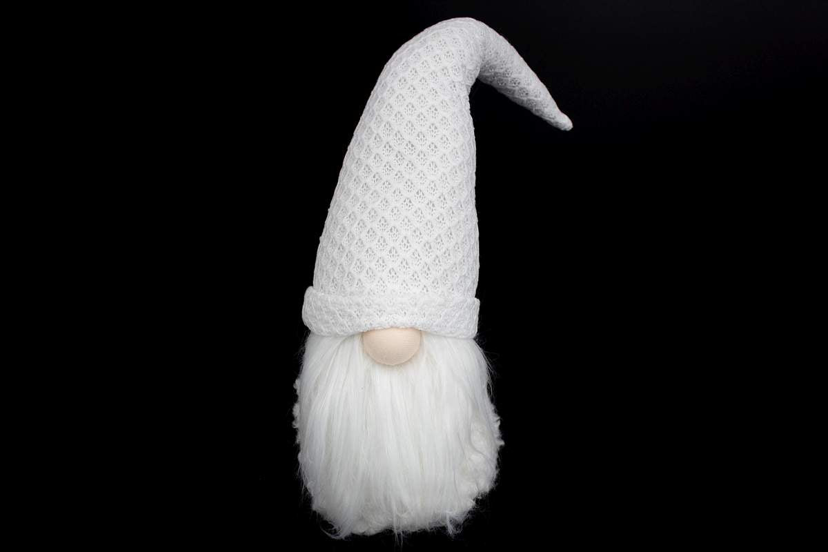 This standing gnome has a white coloured hat made of luxurious soft fluffy fabric with silver accents. According to traditional folklore they are believed to protect against evil and misfortune.
