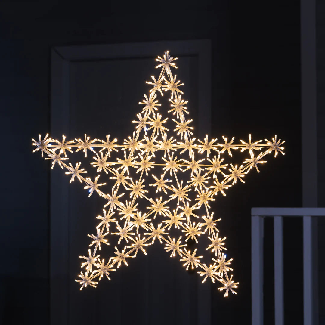 Elevate your ambiance with the captivating White Frame Metal Snowflake Star light. Mesmerizing Snowflake Illumination unfolds as 432 warm white LEDs and 36 cool white flash bulbs create an enchanting display. The Stunning Design boasts a 60cm diameter, radiating elegance. Dynamic Lighting emerges as warm white and cool white twinkle lights intertwine magically. Robust Construction ensures lasting quality with durable plastic, iron, and copper. Setup is both Easy and Secure with the included UL24v adapter. Ideal for indoor spaces, it casts a warm and festive Indoor Elegance. Effortless Arrangement invites you to hang or display, infusing charm into your surroundings with its captivating dual-color glow.