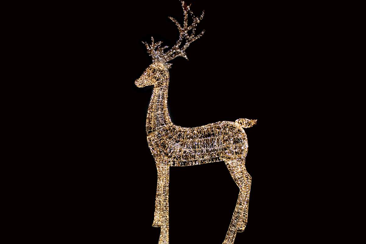 LED Christmas Shiny Gold Reindeer with 4300 warm white lights 106" indoor/outdoor. Luminous Christmas deer made of metal and illuminated by 4300 warm light LEDs. This Christmas reindeer decoration is suitable for use both indoor and outdoor spaces such as the garden or terrace.