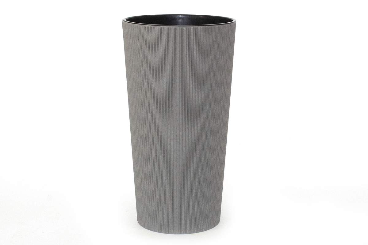 High plastic flower pot from the outside decorated with a band and a matte finish, conical shape and with removable insert in black plastic. To the plastic liner you can plant plants directly if you drill a drain into the bottom of this insert. hole. The new range of ECO Flower Pots is made from recycled plastic with a mixture important wood.