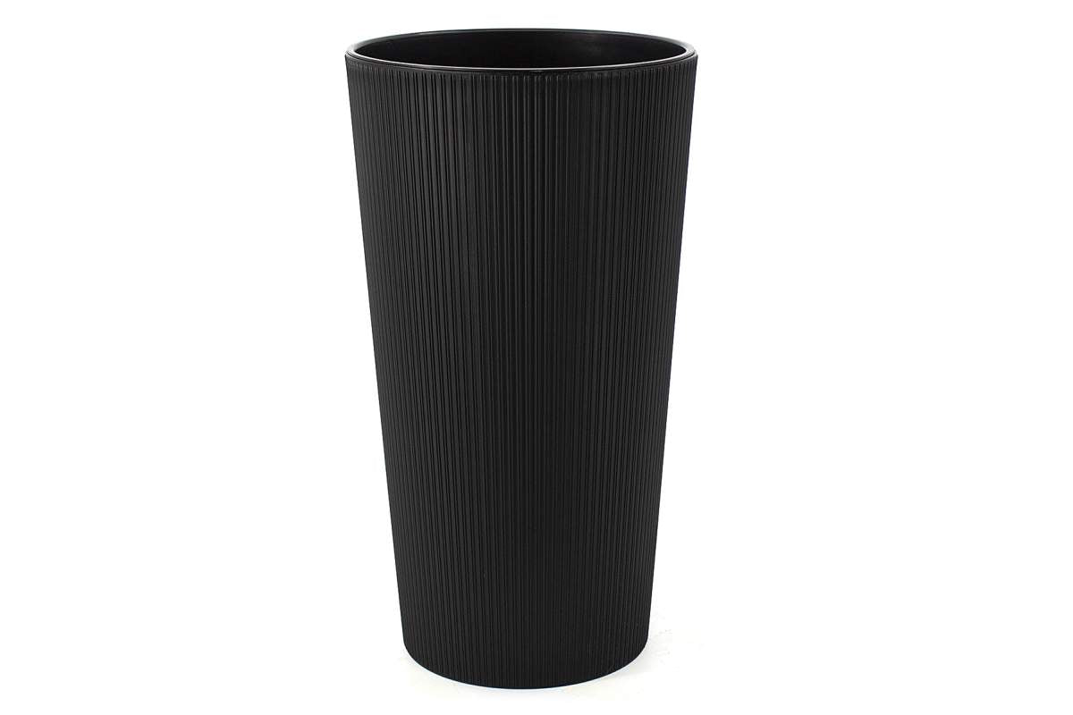 High plastic flower pot from the outside decorated with a band and a matte finish, conical shape and with removable insert in black plastic. To the plastic liner you can plant plants directly if you drill a drain into the bottom of this insert. hole. The new range of ECO Flower Pots is made from recycled plastic with a mixture important wood.