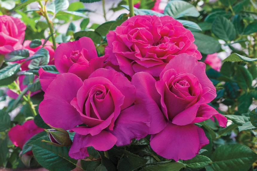 Large old-fashioned and English style multi-petaled aristocratic-like deep pink flowers. Long lasting flower colouration is enhanced by the sweet scented peony-like and spices fragrance.