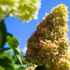 Hydrangea paniculata 'HYLV17522' - The creamy lime coloured blooms mature to a rich pink. Nice and compact with an upright habit. Prune in spring. Has shallow roots and is fast growing. Use Bone Meal when you first plant. Do not fertilize the first year. Fertilize once a year with a balanced granular fertilizer. Do not plant any deeper than it is in the pot. Do not add any soil or mulch around the base of the stem. Water deeply once a week for about 20-30 minutes whether is rains or not. Plant at least 3-4 feet from any foundation.