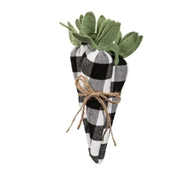 Add an extra dose of whimsy to Easter décor and springtime tabletops with this bundle of Fabric Buffallo Check Carrots. The plush bundle of 3 carrots have felt leaves and bring a delightful accent to mantels, bookshelves, tabletops, and more. Tied together with a rustic twine bow, the carrots are crafted of a bold black and white buffalo check fabric that creates an interesting look. Perfect for Easter and Spring.