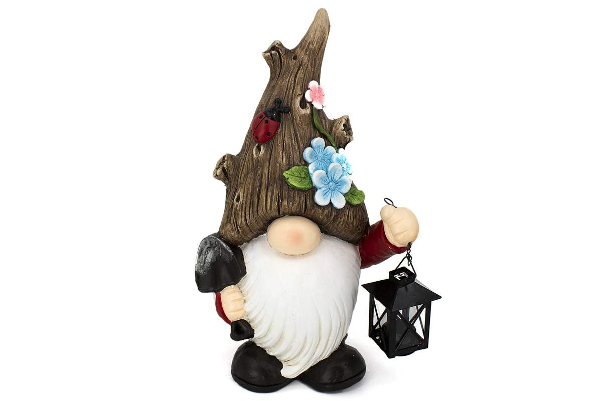 Add a whimsical touch to your outdoor space with this outdoor garden statue. This charming gnome, featured a wood like hat with cheerful flower accents, adding a touch of whimsy to any outdoor space. Holding a classic black lantern and a rustic brown garden tool, inviting visitors with open arms. This enchanting gnome is ready to brighten your garden and spread a warm welcome to all who enter.