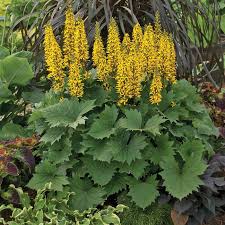 A very large Ligularia perfect for making a dramatic statement in the shade garden. Deep green leaves are massive, and have been known to reach up to 16" across at maturity. A serrated margin surrounds each dissected leaf for a standout foliage presence. Golden yellow flowers have long petals. Best performance in morning sun or filtered shade; flowering will be diminished in deep shade.